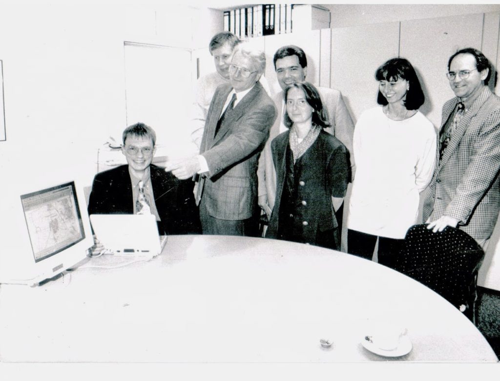 Anmerkung: dieser Blog-Eintrag ist natürlich nachträglich erfasst wurden – alleine schon, weil es so etwas wie „Blogs“ oder „dynamische“ Web-Seiten zu diesem Zeitpunkt noch gar nicht gab. Leider habe ich die Seite damals nicht archiviert – sie war schon, wie üblich zu der Zeit, sehr rudimentär. Auf dem Bildschirm sieht man aber zumindest ein „Top-Feature“ der Site: eine „interaktive Karte“ – je nach Klick gelangte man zu Infos verschiedener städtischer Indstitutionen. Insgesamt gab es wohl so um die 20 bis 30 Seiten.
