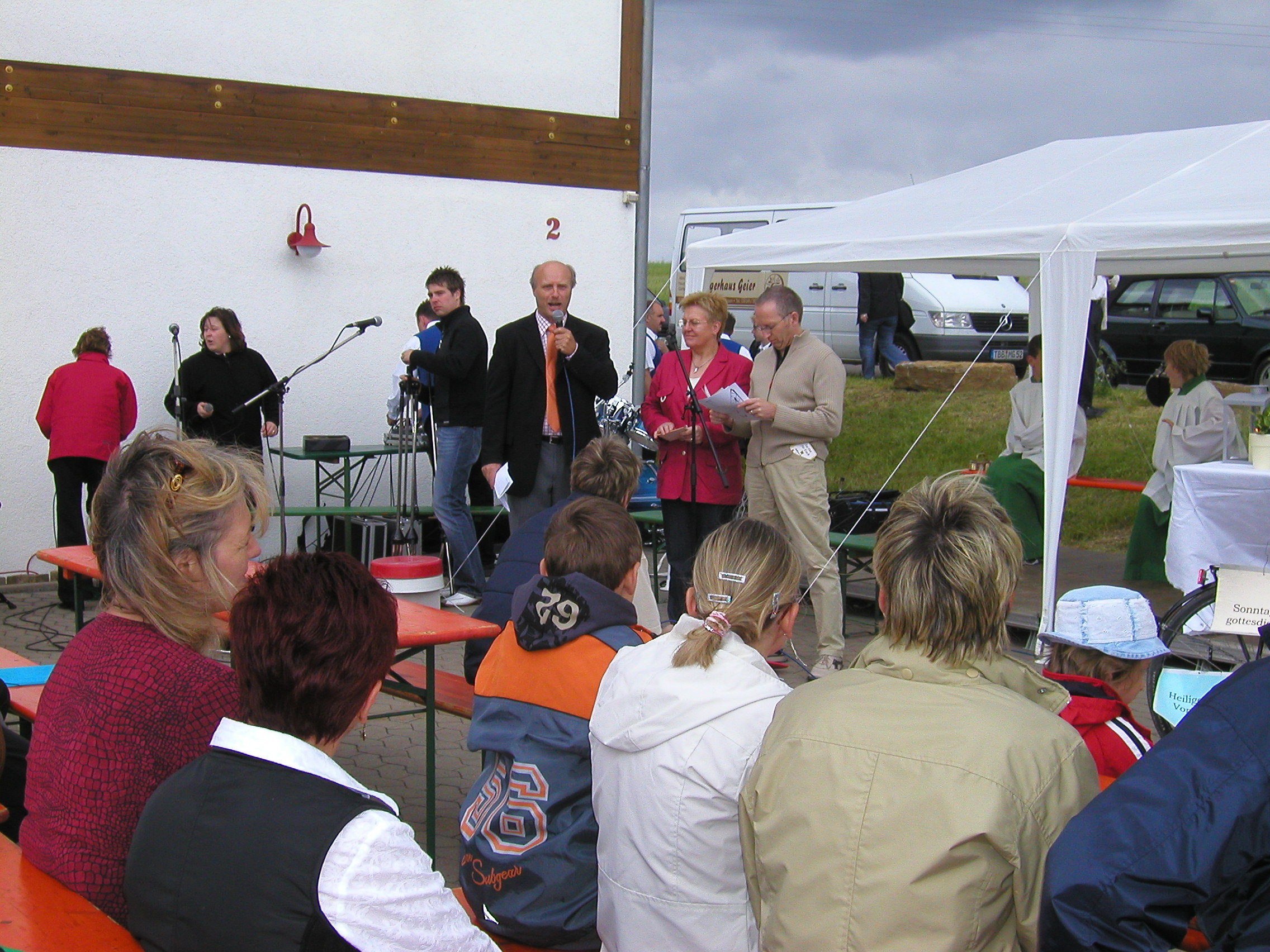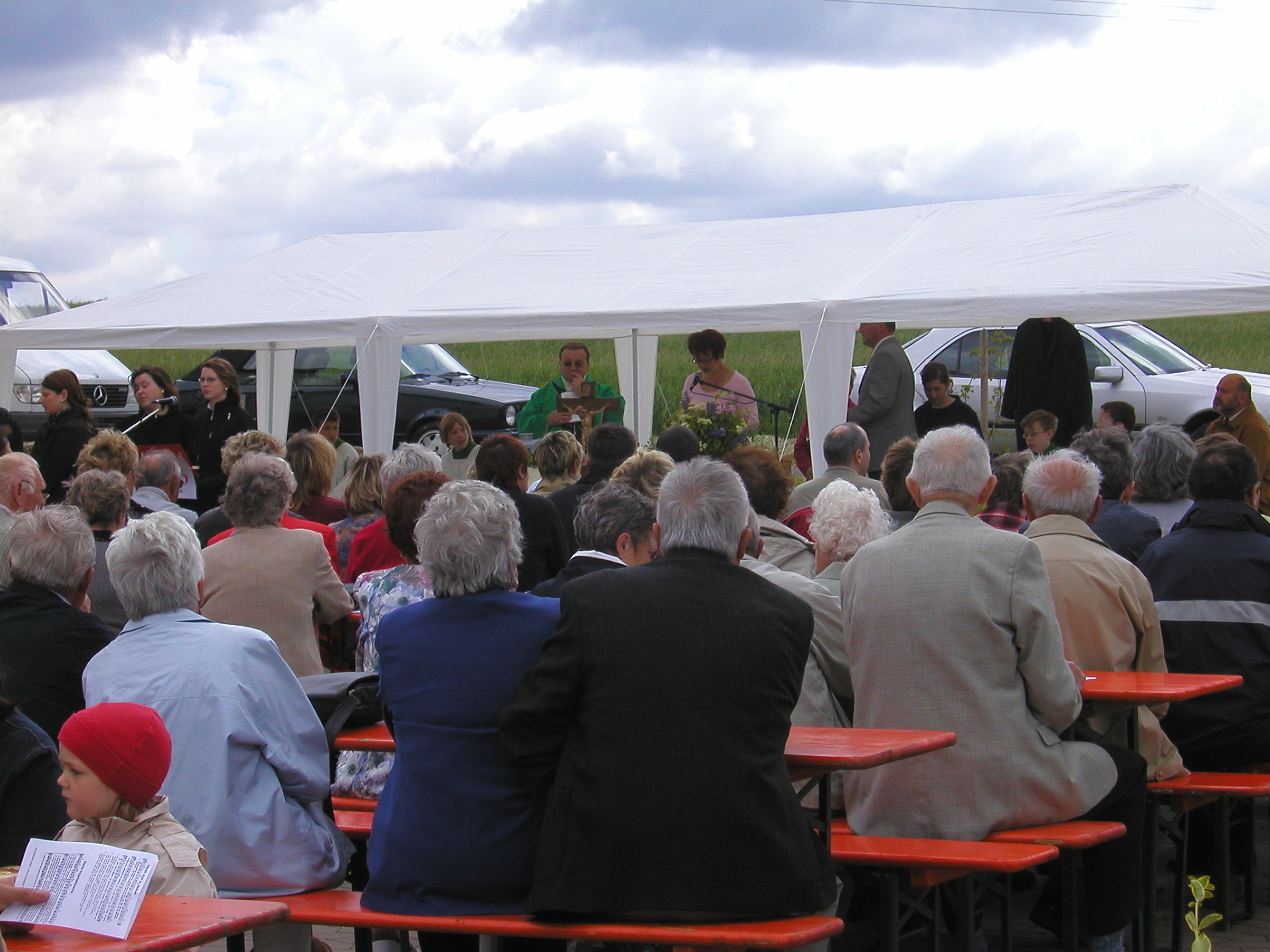 Nach der offiziellen Eröffnung durch Bürgermeister Weiß hielt Pfarrer Damien Samulski den Eröffnungsgottesdienst unter freiem Himmel. Und wie es sich gehörte, blieb es dabei auch trocken. Nach dem Gottesdienst strömten die Besucher dann in die Ausstellung.
