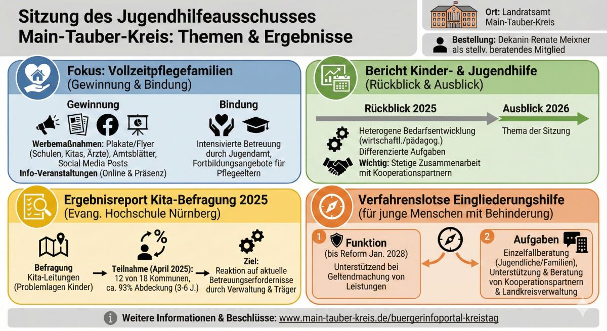 Der Jugendhilfeausschuss des Main-Tauber-Kreises hat vor kurzem im Landratsamt getagt. Auf der Tagesordnung standen unter anderem ein aktueller Bericht der Kreisverwaltung über die Maßnahmen zur Gewinnung und Bindung von Vollzeitpflegefamilien sowie ein Rückblick auf die Kinder- und Jugendhilfe für das Jahr 2025 und ein Ausblick auf das Jahr 2026.