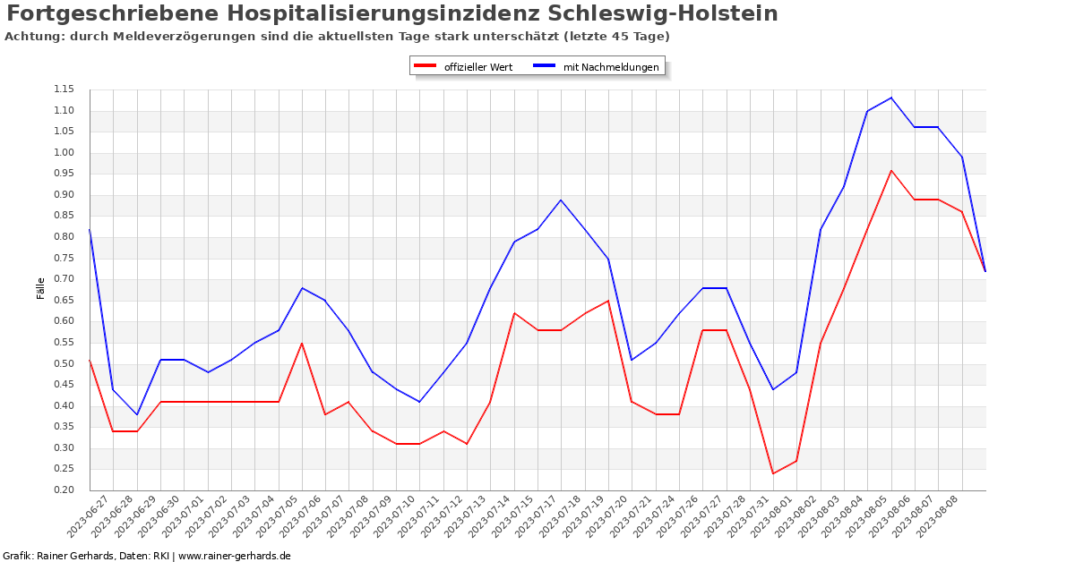 Die Hospitalisierungsinzidenz gibt an, wie viele Menschen in den letzten sieben Tagen neu infiziert wurden und ins Krankenhaus aufgenommen wurden. Fälle, bei denen zwischen Infektion und Aufnahme mehr als sieben Tage vergangen sind, werden nicht berücksichtigt. Die tatsächliche Hospitalisierungsrate wird daher grundsätzlich unterschätzt. Außerdem gibt es erheblichen Meldeverzug, so dass der täglich Meldewert fast immer sehr deutlich zu niedrig liegt.