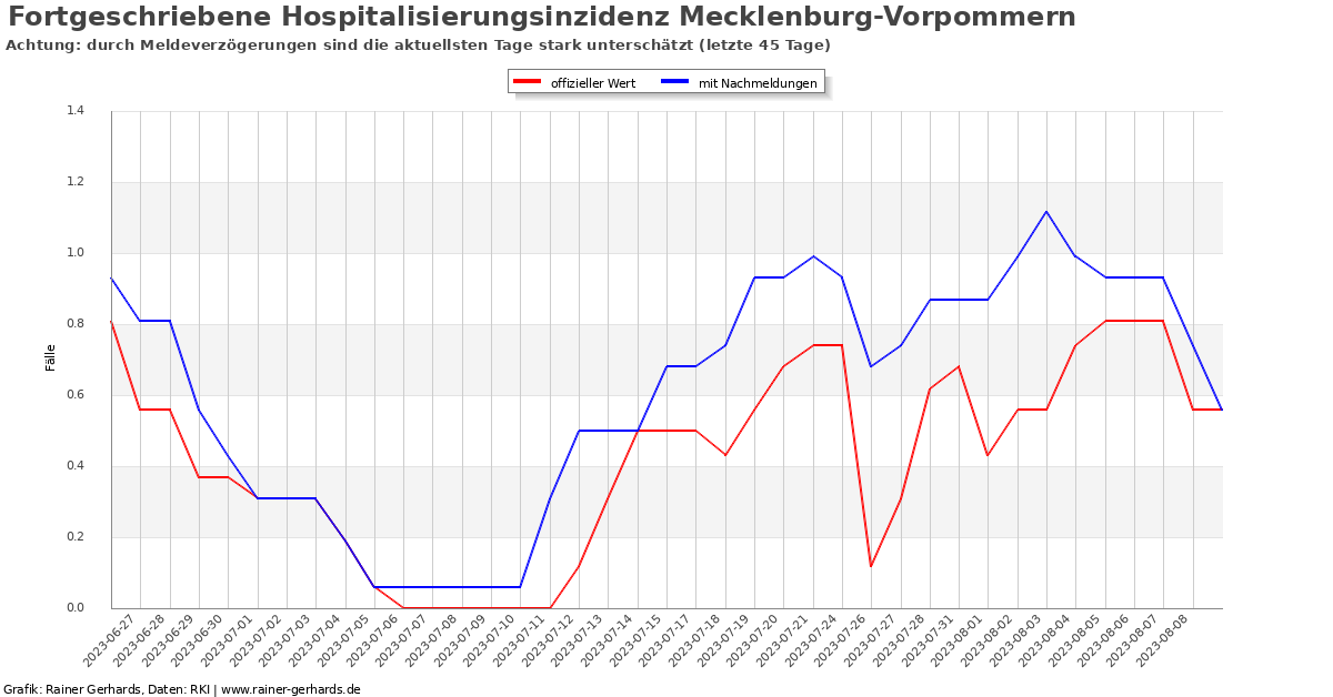 Die Hospitalisierungsinzidenz gibt an, wie viele Menschen in den letzten sieben Tagen neu infiziert wurden und ins Krankenhaus aufgenommen wurden. Fälle, bei denen zwischen Infektion und Aufnahme mehr als sieben Tage vergangen sind, werden nicht berücksichtigt. Die tatsächliche Hospitalisierungsrate wird daher grundsätzlich unterschätzt. Außerdem gibt es erheblichen Meldeverzug, so dass der täglich Meldewert fast immer sehr deutlich zu niedrig liegt.