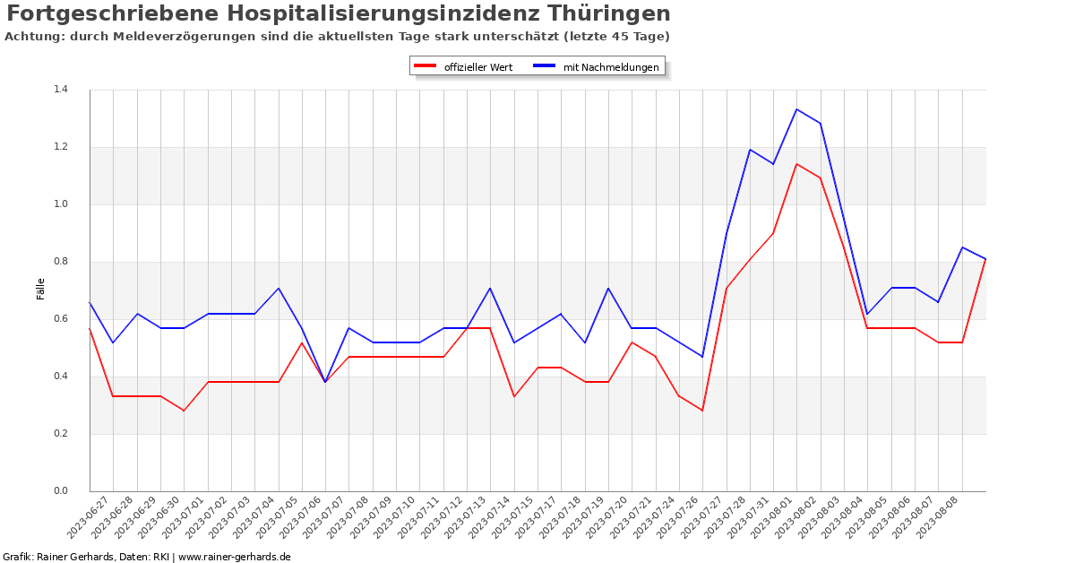 Die Hospitalisierungsinzidenz gibt an, wie viele Menschen in den letzten sieben Tagen neu infiziert wurden und ins Krankenhaus aufgenommen wurden. Fälle, bei denen zwischen Infektion und Aufnahme mehr als sieben Tage vergangen sind, werden nicht berücksichtigt. Die tatsächliche Hospitalisierungsrate wird daher grundsätzlich unterschätzt. Außerdem gibt es erheblichen Meldeverzug, so dass der täglich Meldewert fast immer sehr deutlich zu niedrig liegt.