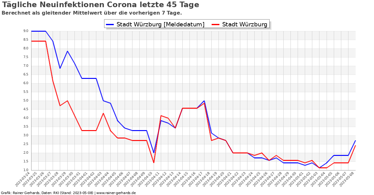 Aktuell ein Experiment: eine rasche Übersicht über die Corona-Lage in Würzburg Stadt, basierend auf den täglichen vom RKI veröffentlichten Daten. Feedback und Wünsche sind willkommen, ob sie realisiert werden können vermag ich aber nicht zu sagen.