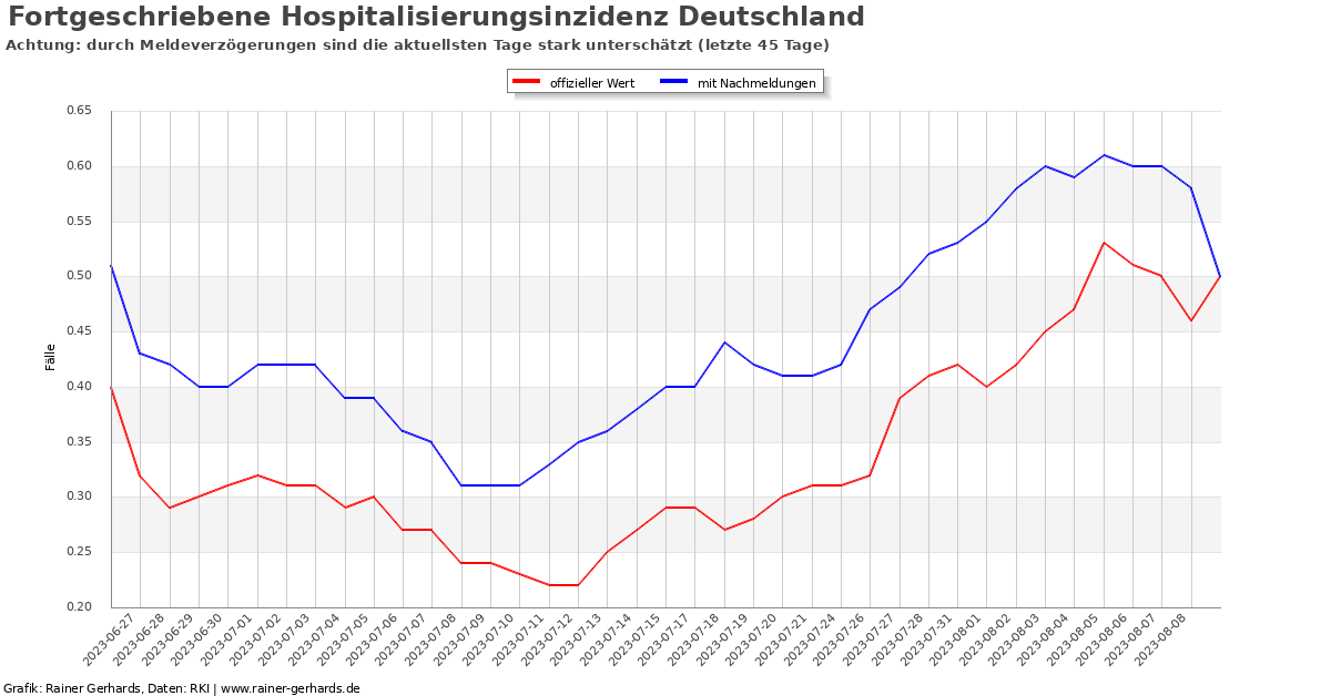 Die Hospitalisierungsinzidenz gibt an, wie viele Menschen in den letzten sieben Tagen neu infiziert wurden und ins Krankenhaus aufgenommen wurden. Fälle, bei denen zwischen Infektion und Aufnahme mehr als sieben Tage vergangen sind, werden nicht berücksichtigt. Die tatsächliche Hospitalisierungsrate wird daher grundsätzlich unterschätzt. Außerdem gibt es erheblichen Meldeverzug, so dass der täglich Meldewert fast immer sehr deutlich zu niedrig liegt.